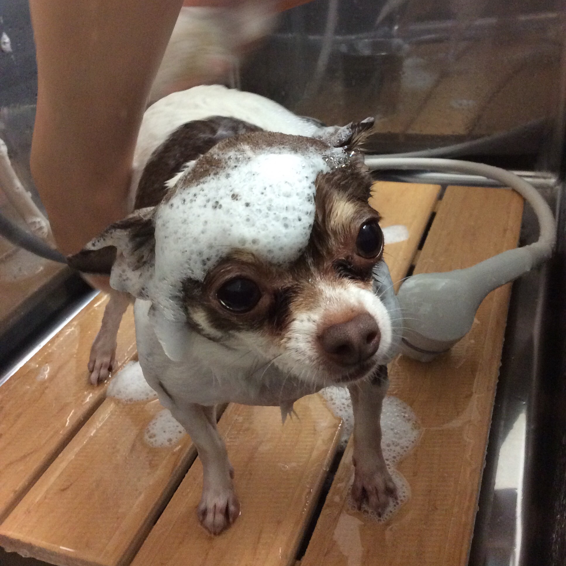 スムースチワワのナノちゃん シャンプー コメントする / シャンプー, チワワ / By ataso0902@gmail.com スムチのナノちゃんが同じお家のアイルちゃんと一緒にシャンプーに来てくれました❤️ お手入れ中も笑顔を見せてくれます(^o^) アワアワになった姿もとても可愛いナノちゃん❤️ さっぱりしたかな? ボーダー柄のマフラーもよく似合っています♪ ナノちゃん頑張ったね❤️