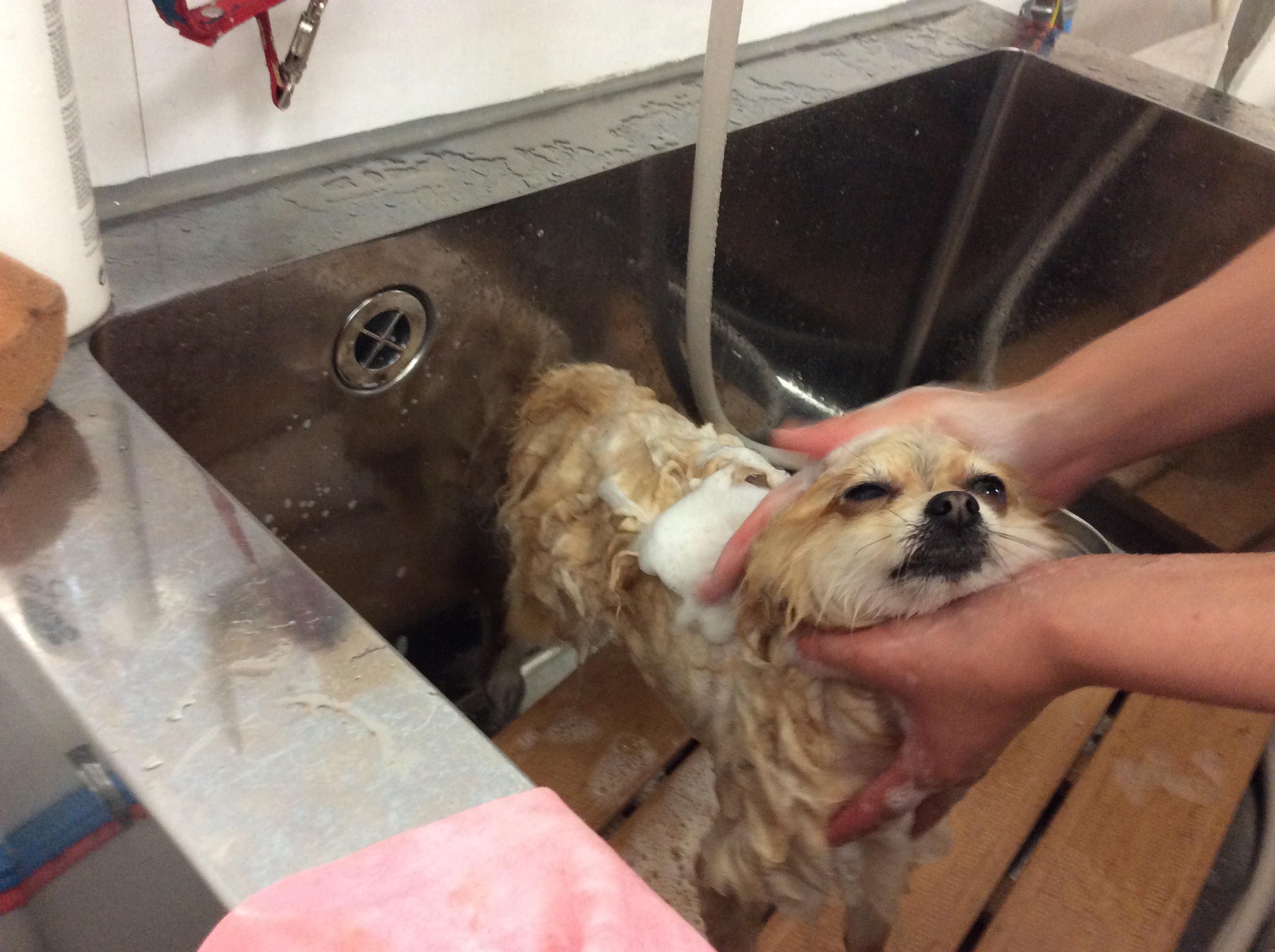チワポメ ムニちゃん トリミング コメントする / 未分類 / By ataso0902@gmail.com 初めてお店に来てくれた チワワとポメラニアンのMIX犬、ムニちゃん 最初はなかなかバッグの中から出て来てくれなかったのですが トリマーに抱っこされると 尻尾を振ってご挨拶してくれました❤️ お迎えに来てくれたママの姿に釘ずけで 記念撮影が横顔なってしまいました>_< ムニちゃん、ありがとうございました(*^o^*)